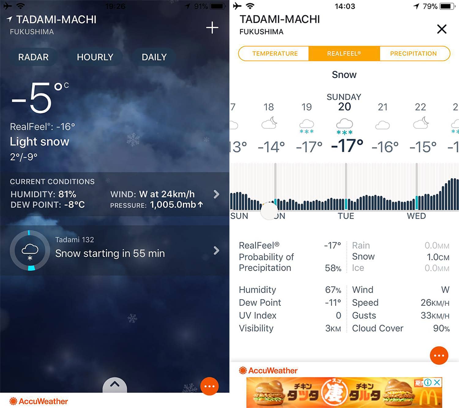 อันดับแรกสุดก่อนที่เราจะจัดกระเป๋าเดินทางได้นั้น เราต้องรู้ก่อนค่ะว่าสภาพอากาศที่เราจะไปเผชิญนั้นจะเป็นอย่างไรบ้าง ทั้งด้านอุณหภูมิ, ความแรงของลม และโอกาสเกิดหิมะหรือฝน เพื่อที่เราจะได้เตรียมตัว เตรียมใจ และเตรียมอุปกรณ์ให้เหมาะสมค่ะ โดย Application ที่ต๋งใช้เป็นประจำคือ AccuWeather ซึ่งถือว่าเป็นแอพที่มีความแม่นยำค่อนข้างสูงเลย ยิ่งใกล้วันเท่าไหร่ก็ยิ่งแม่นมากขึ้น แถมยังดูเป็นรายชั่วโมงได้ด้วย ดังนั้นแนะนำว่าให้หมั่นเข้าไปเช็คเรื่อย ๆ นะคะ จะได้เตรียมตัวถูกทั้งก่อนเดินทางจากไทยและก่อนที่จะเริ่มต้นเที่ยวในวันนั้น ๆ ค่ะ